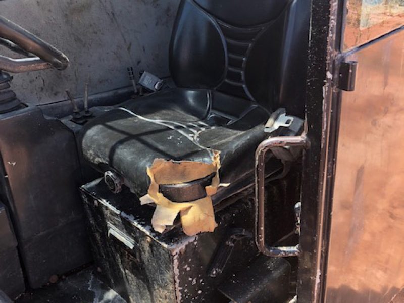 9811 hrs, good runner, no door, no heat, no AC, tires low, foam-filled tires